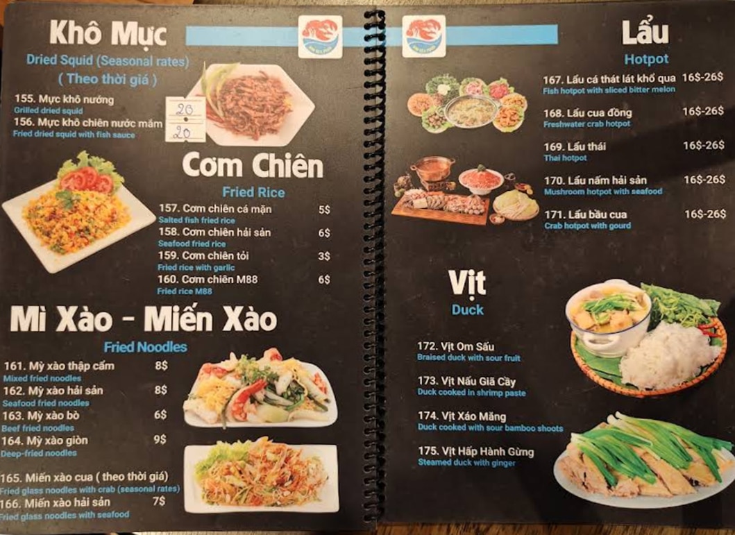 Thực đơn của Nhà hàng M88 rất phong phú với hơn 200 món ăn, giúp thực khách có nhiều lựa chọn và không bị nhàm chán dù quay lại nhiều lần. Mỗi món đều được trình bày gọn gàng, sạch sẽ, cho thấy sự chỉn chu trong khâu chuẩn bị. Đây là điểm cộng lớn đối với những ai yêu thích khám phá nhiều món ăn trong cùng một không gian quen thuộc.